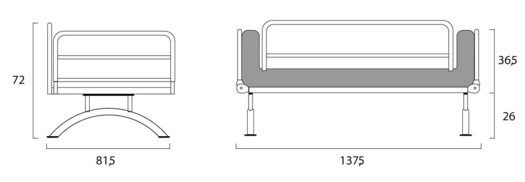A mechanism for two-seater sofas that converts to a single bed with a side opening system and three different armrest angles. Ultra-strong frame in furniture tubing painted with epoxy powders. Sleeping surface with fuse-bonded base.