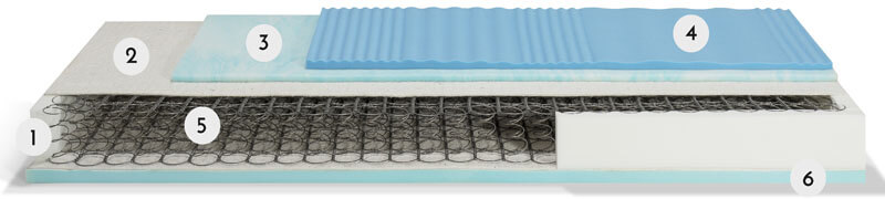 The Bonnell Springs are combined with a profile made up of a sandwich with a contact side in SensityMemory, in order to provide more homogeneous and comfortable support, and one side with a support side in rigid Hidrocell. The particularly ventilated internal structure guarantees perfect ventilation which creates a healthy microclimate during rest, as well as acting as natural insulation. The structure is very compact thanks to the use of rigid Hidrocell on the perimeter.