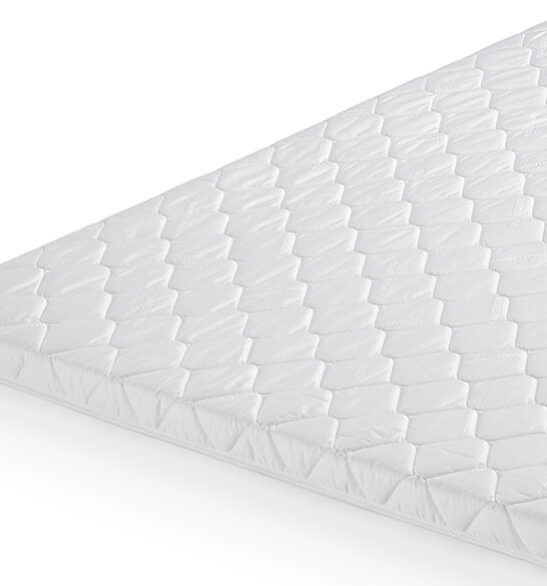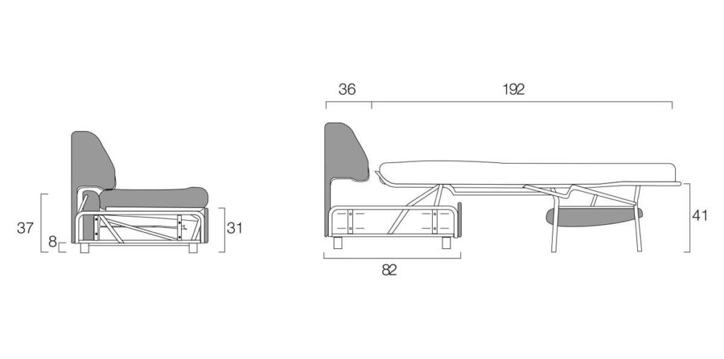 An insertion mechanism with two-fold opening, fitted with a tilting system that makes it possible to fold out the sofa bed in a single movement without removing the seat cushions. Mattress support surface with base in fuse-bonded steel and elastic straps. Ultra-strong frame in furniture tubing painted with epoxy powders.